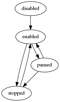 | 'paused' | Pauses the sync process. The process is configured but is not currently executing any sync commands. | 'enabled' 'stopped' |